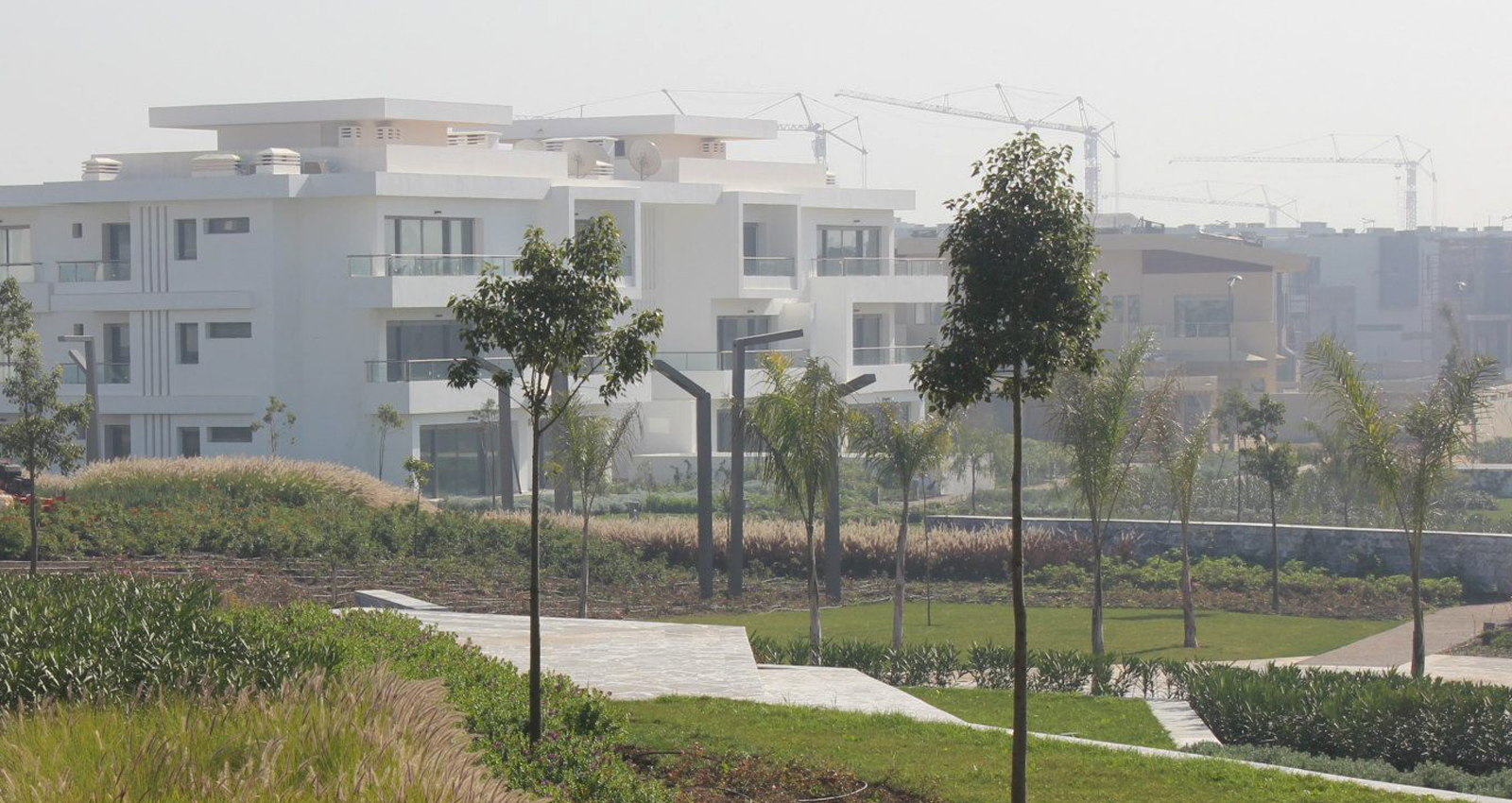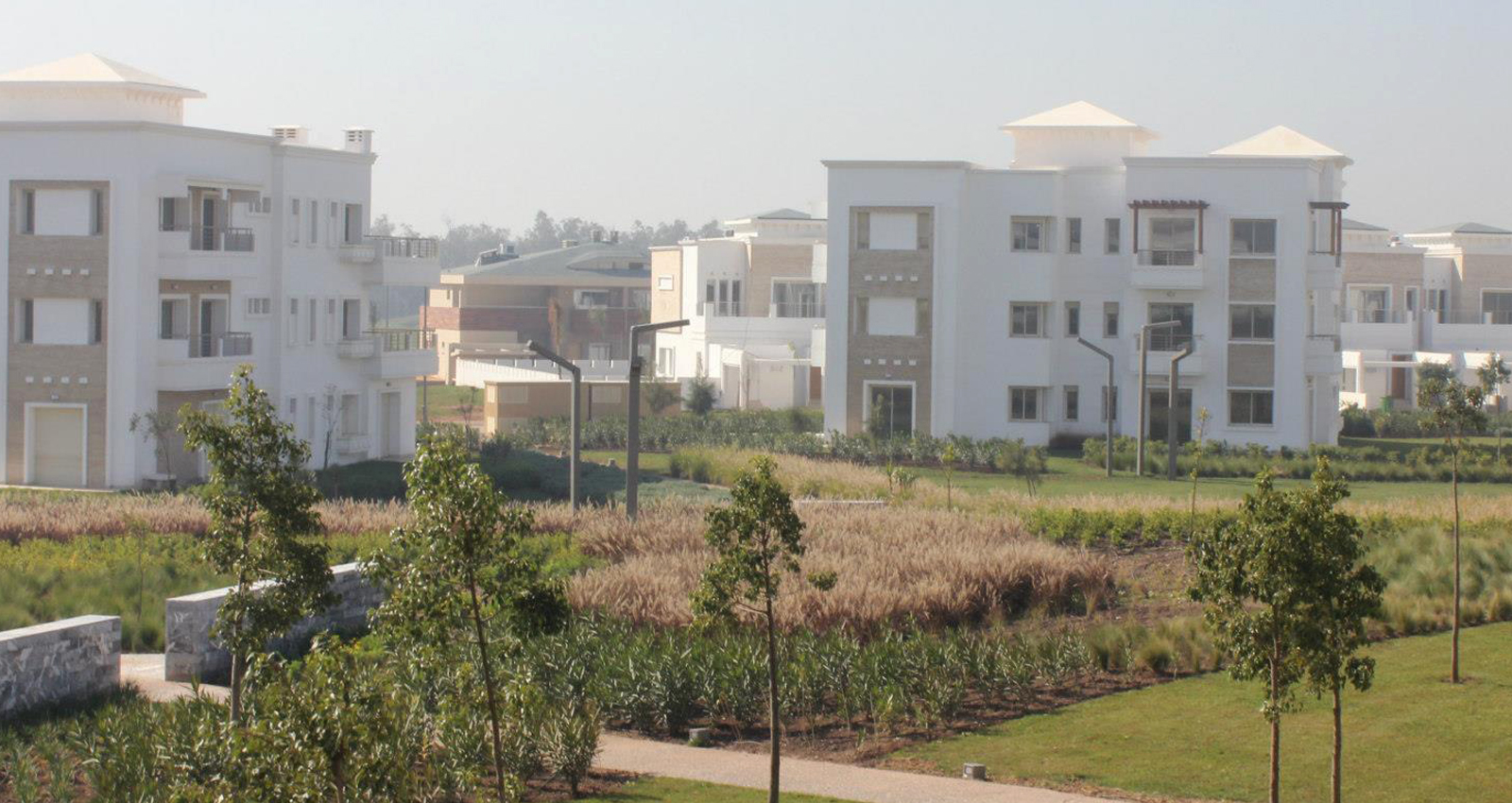 Bouskoura Golf City est une opération de 20 Ha, proposant un pôle résidentiel aux limites de Casablanca, à coté de la Forêt de Bouskoura. Cette forêt caractérisée par des Pins d’Alep, des Eucalyptus et une flore riche et variée en lisière (Graminées, Palmiers nains, Orchidées sauvages, Fenouils sauvages) entoure le site sur 3 cotés. En travaillant sur l’accompagnement de voirie et les jardins des copropriétés des trois premières parcelles nous avons aménagés les différentes fonctionnalités (les piscines, les aires de jeux, les jardins des résidences)d’une manière à renforcer les vues vers la forêt. Nous avons également remodelé la topographie existante afin de prendre en compte les contraintes imposées par les bâtiments, la voirie et le golf. La majorité des végétaux sont indigènes et bien adaptés au climat local afin de réduire le besoin arrosage. Les plantations ont été développées pour créer des séquences distinctes pour les différentes parcelles tout en gardant une continuité le long des trottoirs et cheminements publics créant au même temps une liaison avec la végétation existante en lisière de la forêt. Des grandes zones de graminées accompagnent les cheminements. Des massifs arbustifs indigènes définissent la limite entre les espaces privés et publics, tandis qu’une végétation plus ornementale, constituée d’arbustes fleuris et de cépées accompagnent les piscines.
