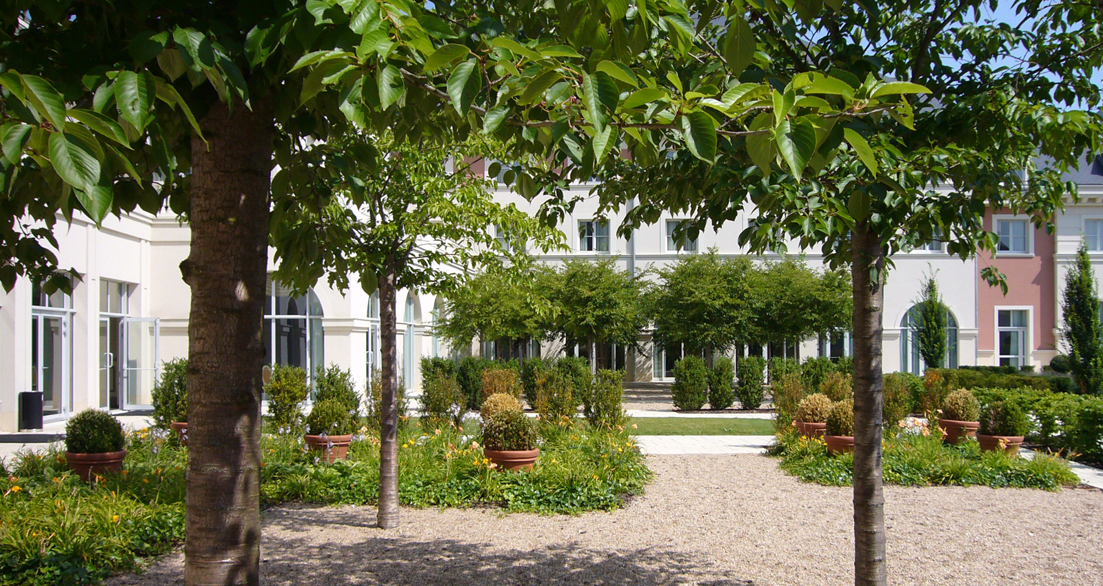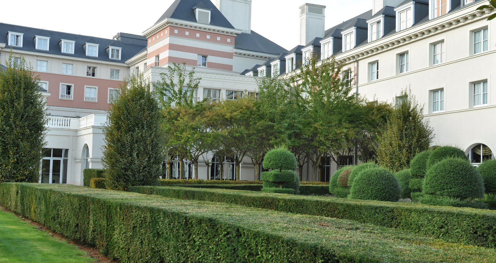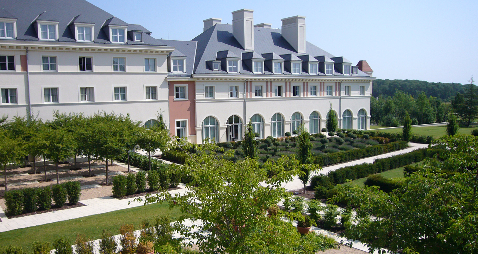Le site de l’hôtel est localisé dans une des entités paysagères les plus précieuses de la région. Le traitement des aménagements extérieurs est sensible à cet environnement remarquable et met en valeur la richesse existante du site, en prenant compte des éléments forts du paysage qui sont les suivants : La topographie en pente, offrant des vues dégagées sur la vallée de la Marne. Le caractère agricole du paysage, la présence de boqueteaux et de boisements, éléments rares sur le plateau agricole de la Marne sont mis en valeur par des cadrages de boisement. Le plan d’eau en limite Est du site, offre un premier plan attrayant au tableau général du paysage. Les aménagements extérieurs se composent de trois entités: La séquence d’arrivée de l’hôtel et les stationnements intégrés de part et d’autre d’un axe majeur. La succession de pièces extérieures structurées par des terrasses, des jardin de topiaires et un carré de pelouse. Enfin, la prairie et les boqueteaux, espaces naturels en pente se déversent et s’ouvrent vers le plan d’eau.