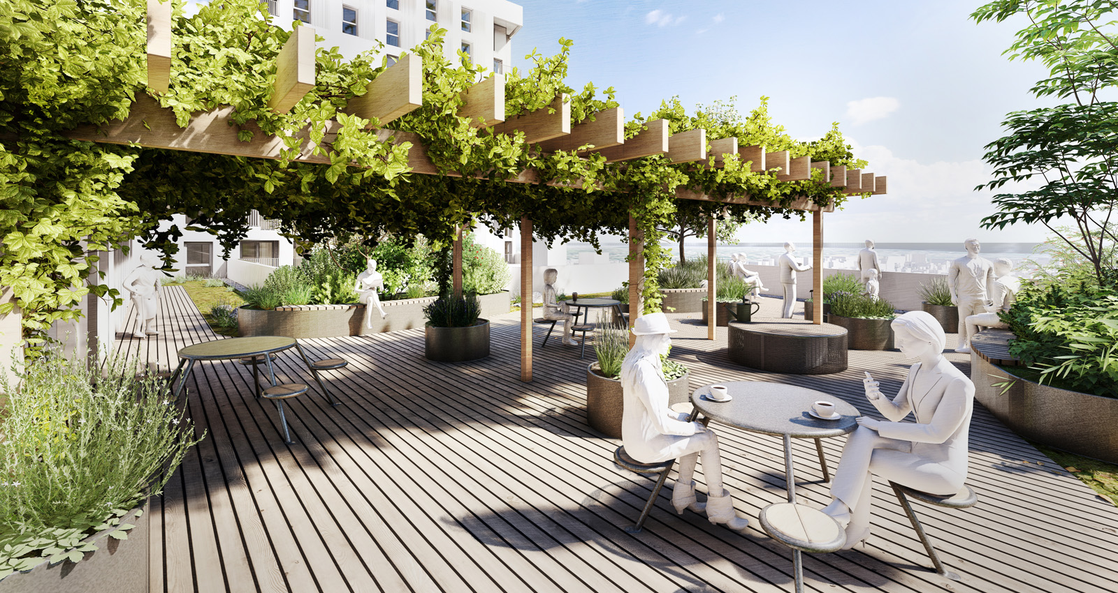 La terrasse commune, située au R+8, prolonge cette logique de lien entre nature et habitat. Organisée autour du thème du comestible, elle propose des bacs potagers accessibles et pédagogiques, invitant chacun à une interaction consciente avec le vivant. Le mobilier et la structure de la pergola créent des ambiances variées : des lieux de rassemblement pour partager un repas, des coins calmes pour la lecture ou la contemplation. Nichoirs et hôtels à insectes enrichissent l’écosystème et sensibilisent à la biodiversité urbaine, tandis que plantes grimpantes comestibles renforcent la dimension végétale et utile de l’espace.