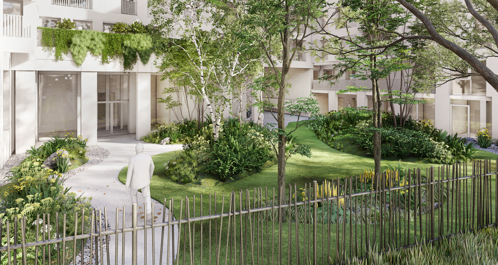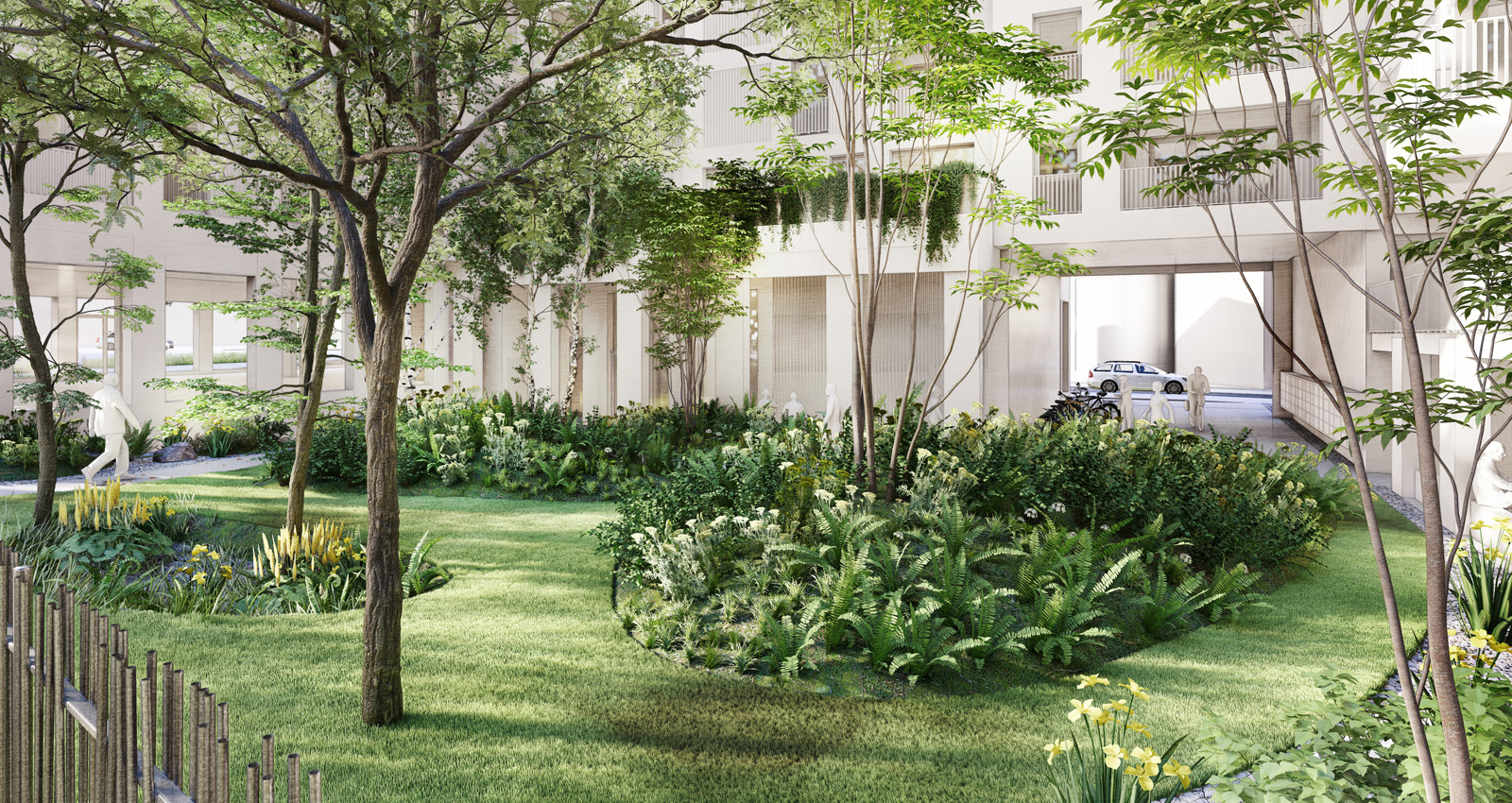 La conception paysagère place la biodiversité au centre. Les essences végétales, choisies pour leur diversité et leur adaptation, génèrent des ambiances sensorielles riches et variées. Le bruissement des feuillages, le chant des oiseaux, les parfums des herbes aromatiques et la présence de fruits à cueillir structurent l’expérience quotidienne. L’évolution saisonnière des plantes rythme le temps des habitants, tandis que la densité de la végétation, combinée à de grands arbres caducs, offre à la fois ombre et lumière selon les saisons. Un jardin creux, destiné à la rétention des eaux pluviales, contribue à un microclimat rafraîchissant, renforçant le confort et la qualité de vie.