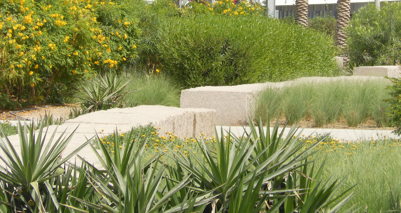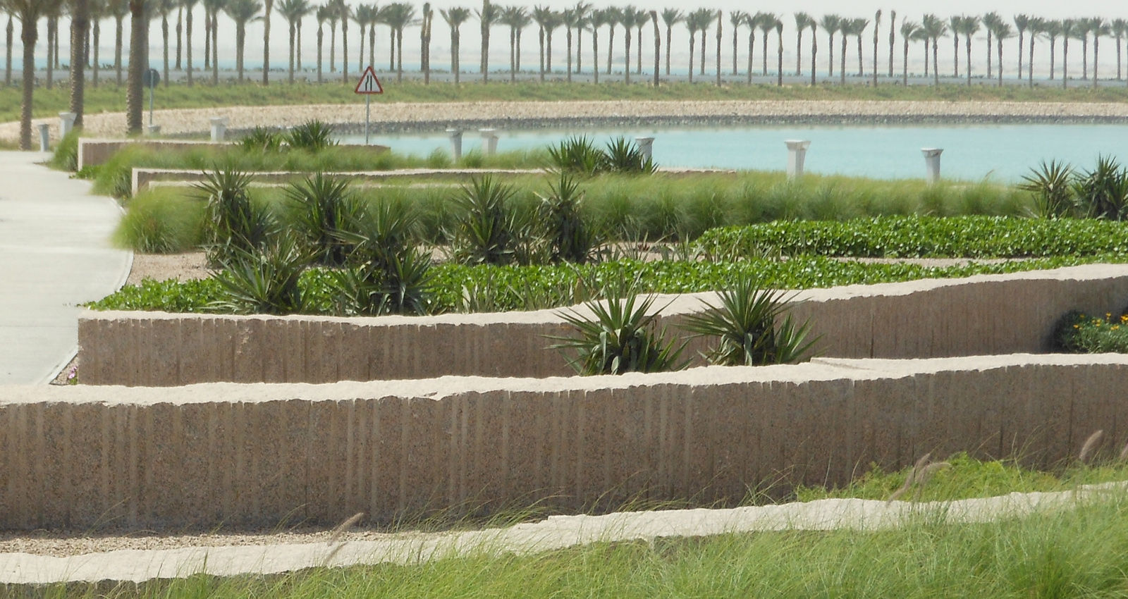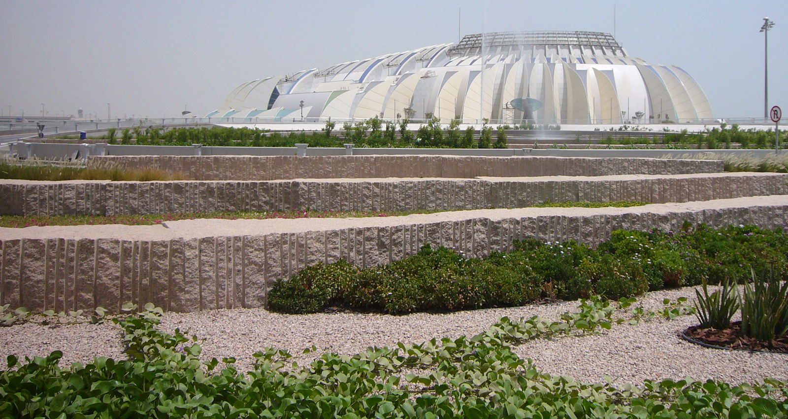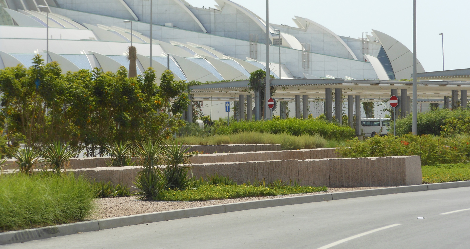 L’enjeu du projet est d’offrir un cadre prestigieux au terminal de l’Emir et des VIP. Le parti-pris paysager s’inspire des barrières de corail. Les murets bas s’organisent en strates légèrement terrassées, alternés par des plantations luxuriantes. Ce paysage sculptural joue le rôle de niche écologique ; les espèces choisies tolèrent la sécheresse et les conditions maritimes : arbres solitaires, ornementaux, palmiers, arbustes fleuris, couvres-sols présentent une variété de formes et de textures rappelant la richesse des récifs coralliens. En périphérie du site une végétalisation extensive permet de réduire la consommation d’eau.