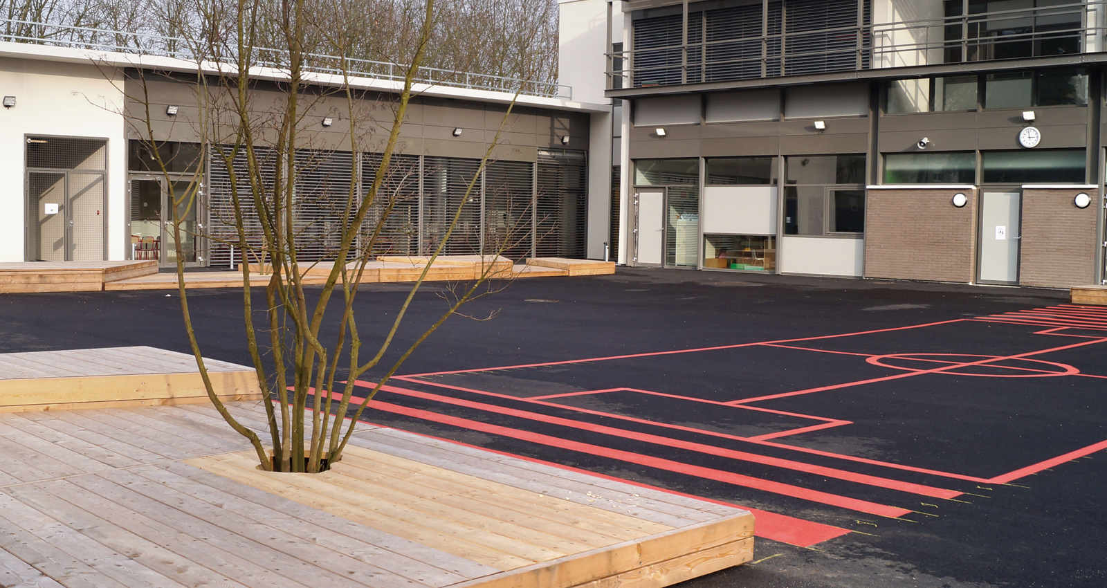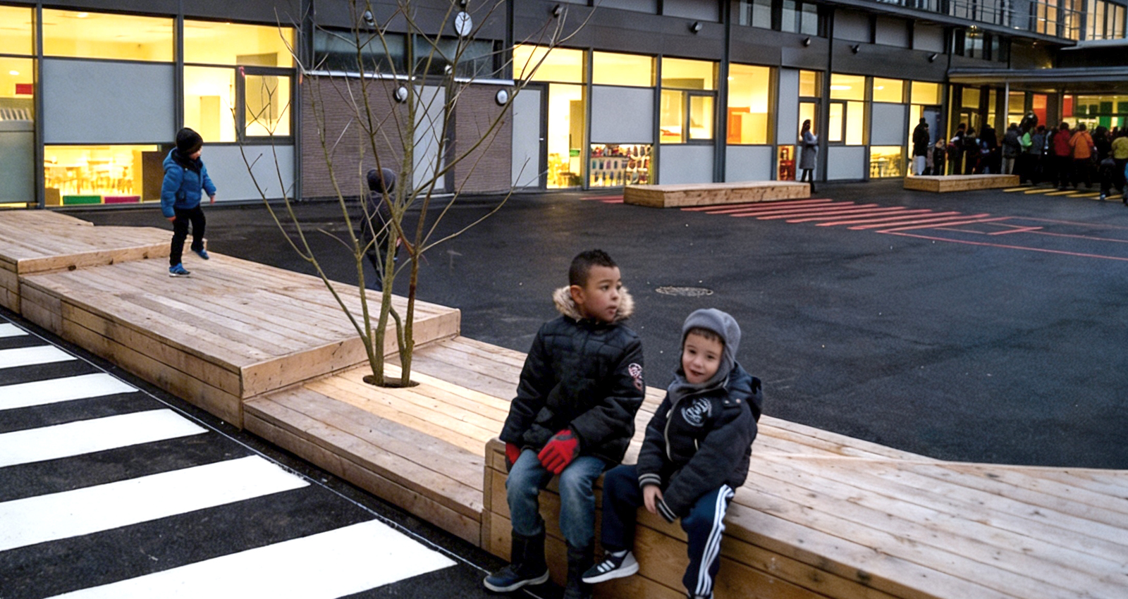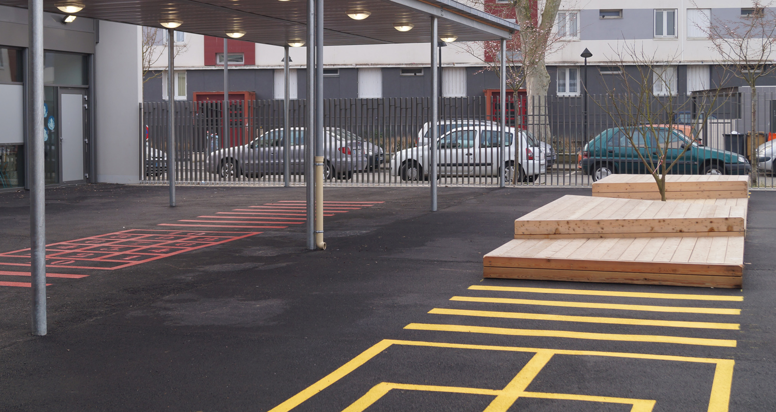 Le parvis est une donnée essentielle du projet, il est lui-même conçu dans la logique des géométries du site et de ce fait, nous avons positionné la façade d’entrée du groupe scolaire en fond de perspective. Les ilots plantés sur le parvis permettent l’assainissement par une infiltration lente des eaux de pluie. Les ilots sont accompagnés par des murets bancs de différentes hauteurs pour s'adapter à tous les publics. Le bâtiment du groupe scolaire partitionne le terrain en 2 parties où seront installées les cours de récréations, indépendantes mais reliées par un de leurs préaux, au droit de la bibliothèque. La majorité des salles de classes de la maternelle disposent d’un espace de dégagement extérieur protégé par des socles en bois. L’aménagement des cours reprend la conception générale du projet issue du parcellaire ancien et se développe en lanières alternant des socles en bois et un graphisme multi couleur tracé sur le sol en enrobé.