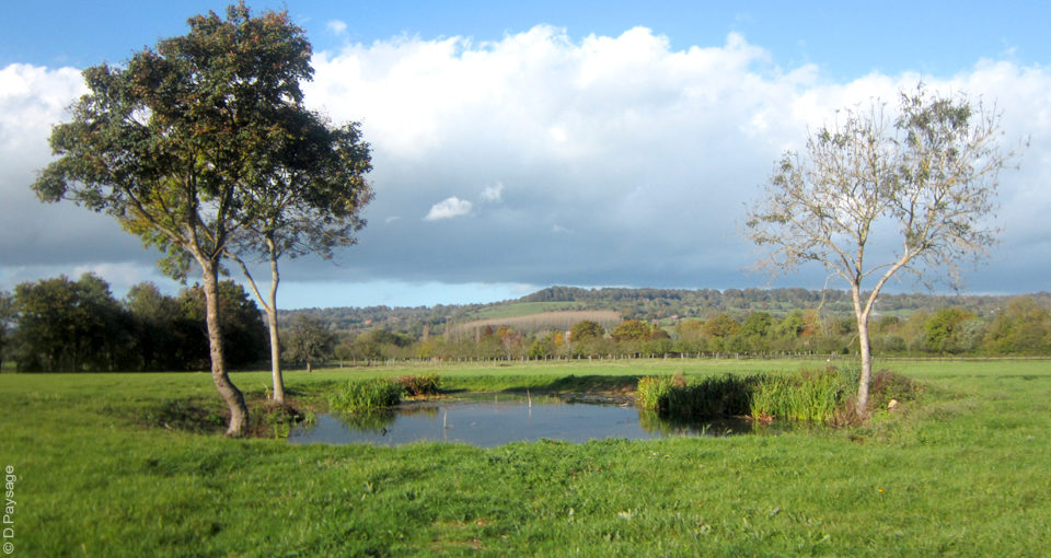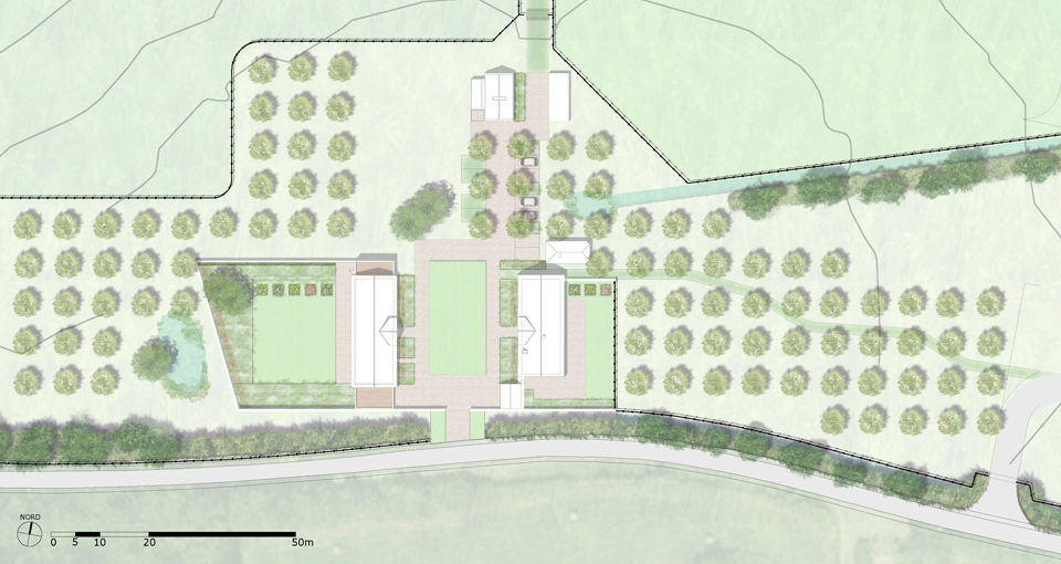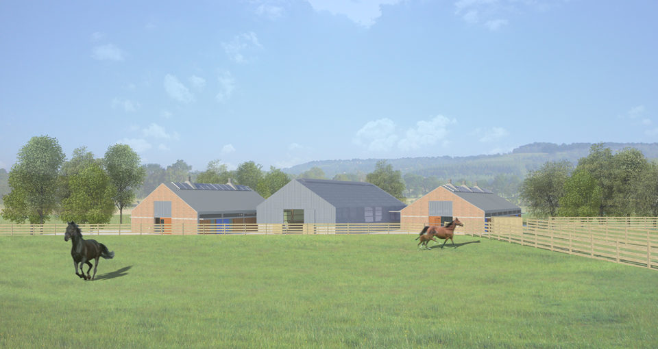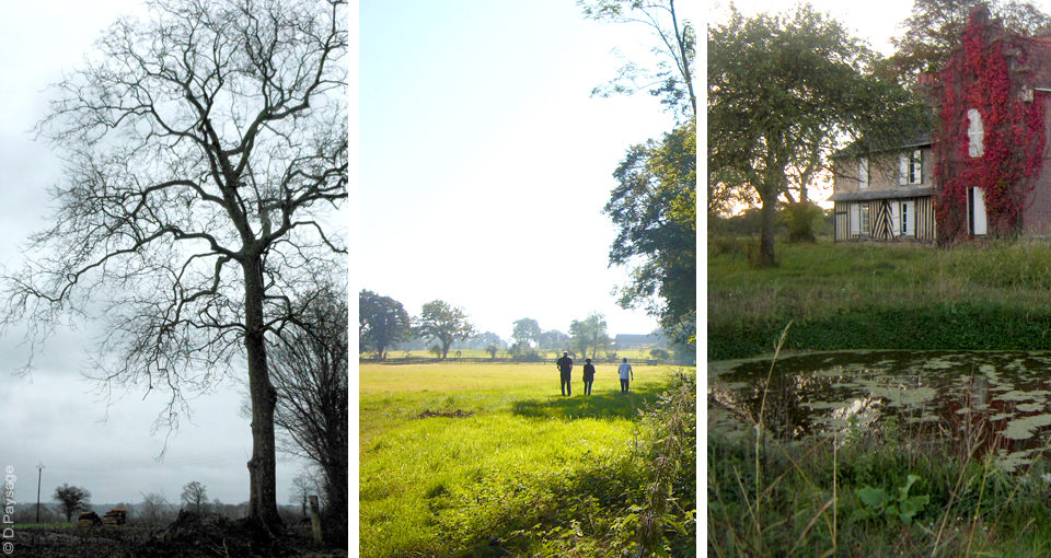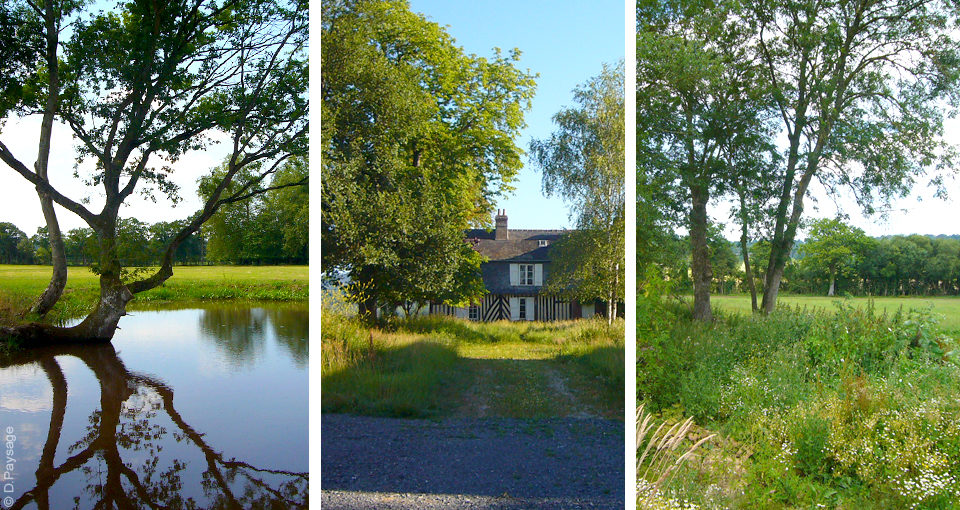Haras pour pure sang anglais  -- Le projet de création du Haras s'inscrit dans le Pays d'Auge, paysage de bocages et de vallons façonné par l'agriculture. Situé sur un coteau en basse Normandie. Anciennes terres agricoles, elles ont conservé un grand nombre de haies bocagères qui sont aujourd'hui des éléments paysagés inscrits au PLU. Une vingtaine de mares ponctue l'ensemble du site et offre un écosystème aquatique important renforcé par la présence d'un cours d'eau qui longe sur une distance d'environ 250m la parcelle au nord-ouest. Dans une démarche de respect et de mise en valeur de l'écologie en place, le projet se développe en étroite relation avec les éléments qui structurent le paysage existant. Les haies bocagères, les arbres remarquables, les mares, les anciens vergers ainsi que les bosquets sont préservés et révélés. Ainsi, l’implantation des bâtiments et des voiries a été méticuleusement pensée pour minimiser l’impact sur le paysage et respecter les prescriptions du PLU.