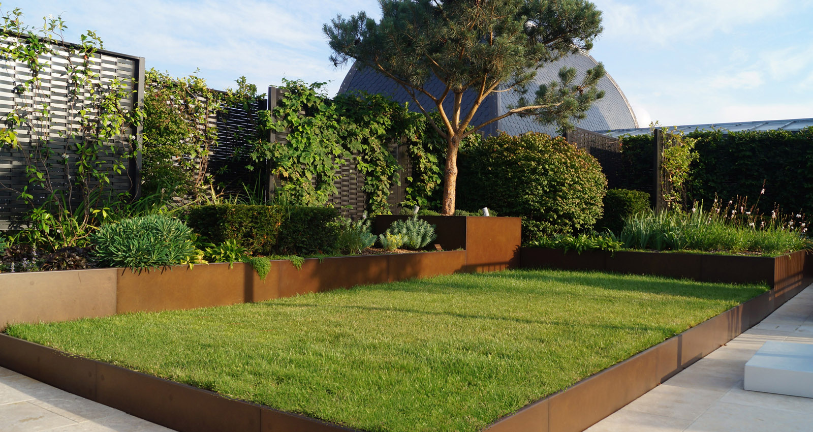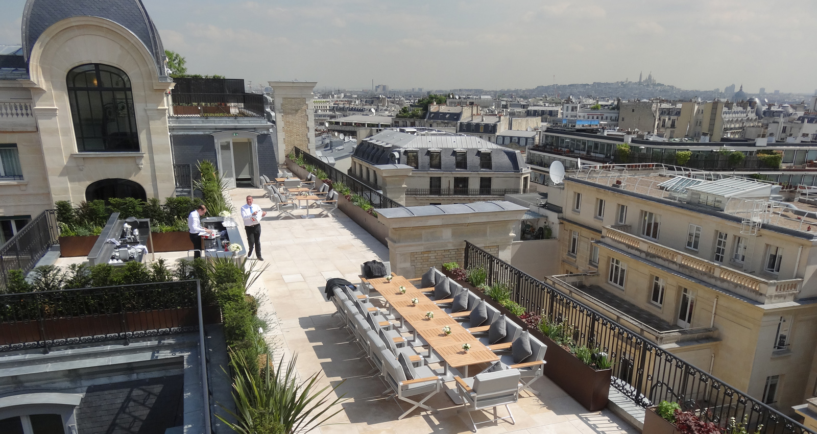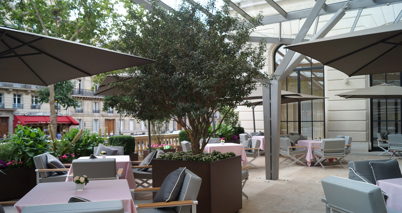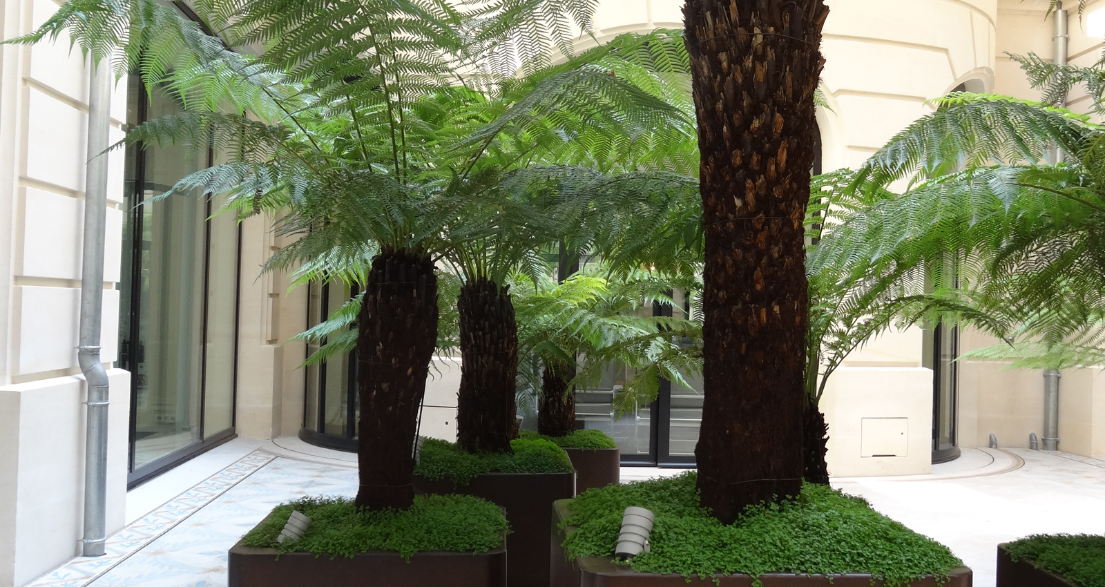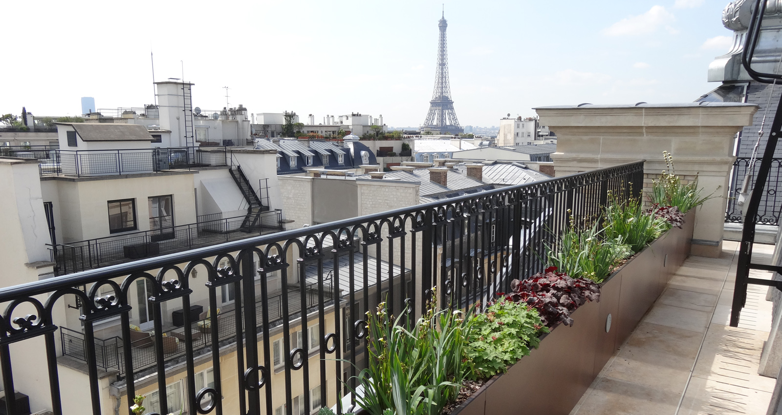 Le Peninsula Hôtel  -- Ce nouveau Palace parisien, situé à quelques pas de l'Arc de Triomphe, se distingue par ses proportions et ses façades remarquables ; il présente plus de 2000m² d'espaces extérieurs. Le projet paysager s'inscrit dans une logique de mise en valeur de l'architecture classique et d'accompagnement des espaces intérieurs. Le mobilier pensé sur-mesure suit une esthétique raffinée et utilise des matériaux nobles. L'entrée principale de l'Hôtel a été transformée. Le trottoir existant est remplacé par un dallage de granit au calepinage régulier qui s'étire jusqu'à la voie. Cadré par des jardinières de bouquets structurées, le Peninsula profite maintenant d'un véritable parvis identifiable depuis l'avenue des Portugais. Sur l'avenue Kleber, la terrasse-restaurant est protégée de la rue par une vaste marquise vitrée. Les balustrades sont plantées de mélanges renouvelés trois fois par an afin que les floraisons accompagnent parfaitement les saisons. Les arbustes en cépée organisent des salons à l'échelle de la verrière monumentale. Le rez-de-chaussée profite d'un patio vitré ouvert sur les boutiques de l'hôtel. Aménagé en jardin d'agrément il offre une atmosphère fraîche et délicate grâce à un minutieux travail sur la matière minérale et végétale. Pensé comme un tableau vu depuis les étages, le feuillage découpé des fougères arborescentes contraste avec l'acier des contenants et fait ressortir la pierre conservée du sol. Le traitement paysager de la toiture du 1er étage suit une logique similaire et des aplats de plantations permettent de dessiner un tapis végétal visible depuis les fenêtres. Les balcons des 4ème et 7ème étages sont plantés de manière à rythmer les façades de l’hôtel. Conçues comme un prolongement des suites, les terrasses privatives sont délimitées par des écrans en aluminium tressé, support de grimpantes. Ces brises-vues donnent de l'intimité aux terrasses et font ressortir la végétation. La terrasse du bar renforce l'exclusivité de l'hôtel en cadrant les vues imprenables sur Paris et notamment sur la Tour Eiffel.