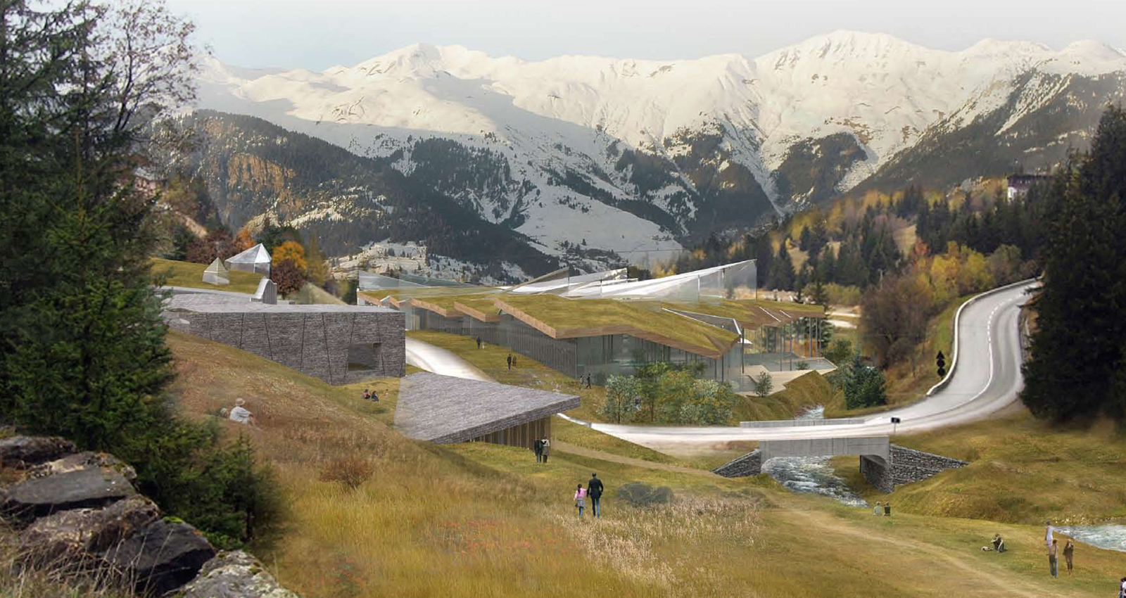 Les grandes combes à Courchevel  -- L’aménagement du complexe sportif des Grandes Combes à Courchevel, station prestigieuse de la vallée de la Tarentaise en Savoie, comprend un centre aquatique, un terrain de grands jeux, une salle de sport, un centre de séminaire et plusieurs aires de sport extérieures. Le projet s’installe en balcon sur le massif forestier, il permet la réhabilitation complète du terrain de 12 hectares, aujourd’hui inconstructible et exposé à des risques naturels importants. Le projet s’appuie sur une démarche environnementale de restitution du paysage en place ; ainsi la palette végétale regroupe des essences locales déclinées en trois catégories, la prairie alpine, la ripisylve et la forêt. Nous avons enlevés les terres des remblais jusqu’aux versants naturels du ruisseau pour reconstituer son lit initial et rétablit le paysage du versant est en intégrant des activités sportives de plein air. Le travail des toitures végétalisées permet de fondre le bâtiment dans le paysage de montagne.