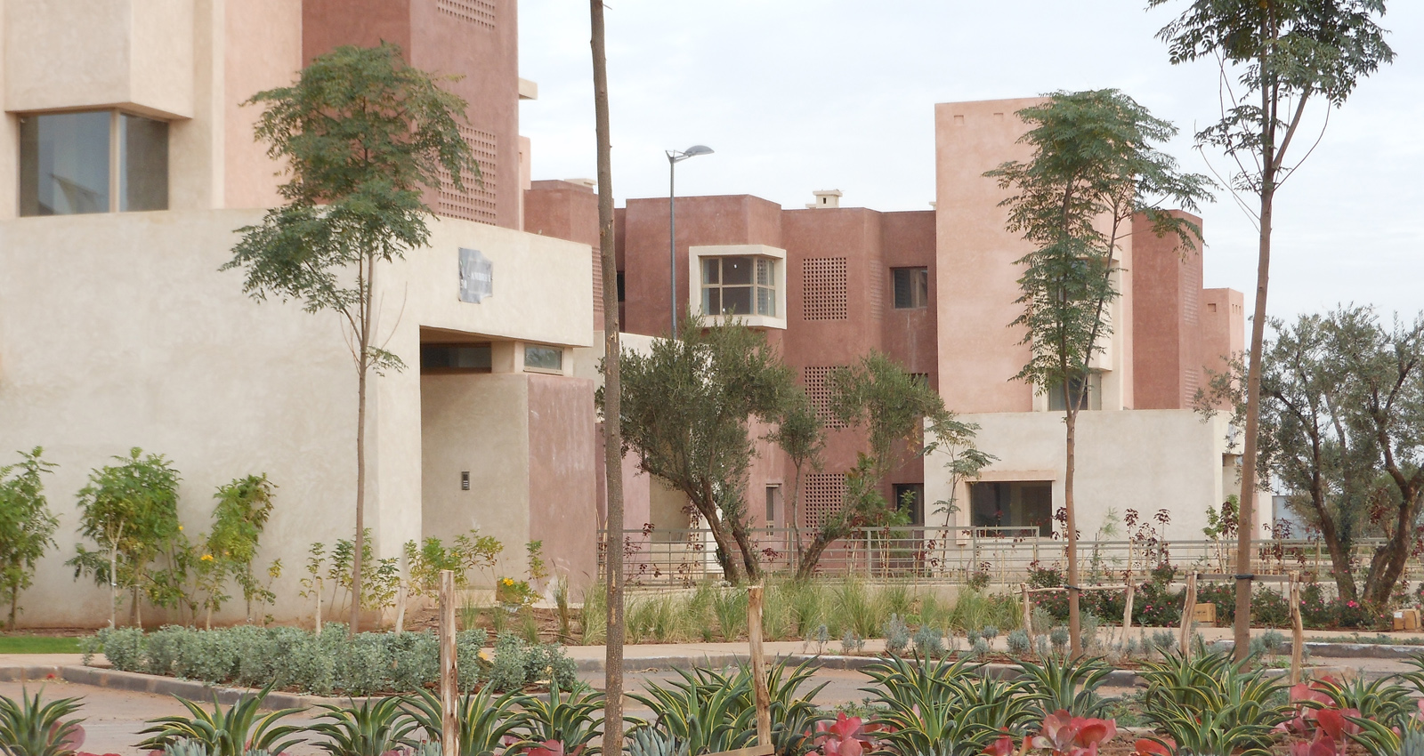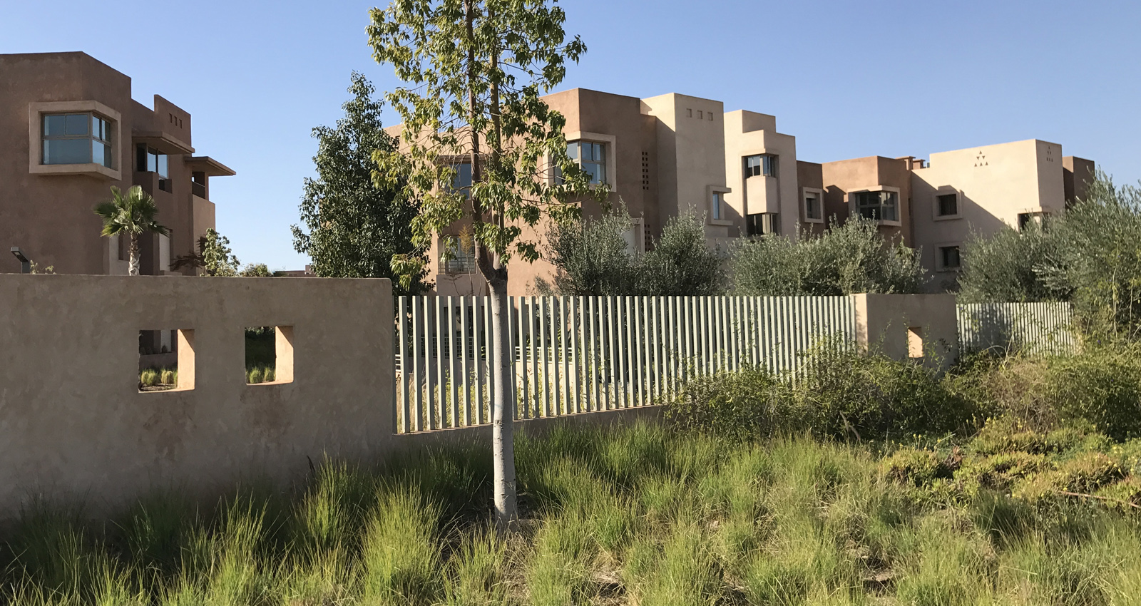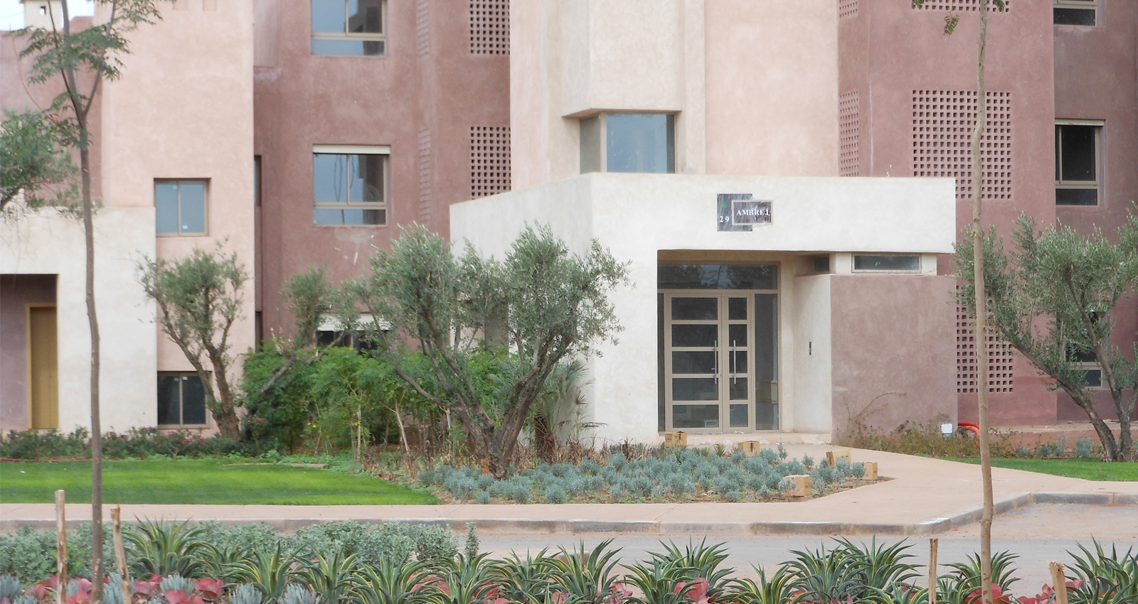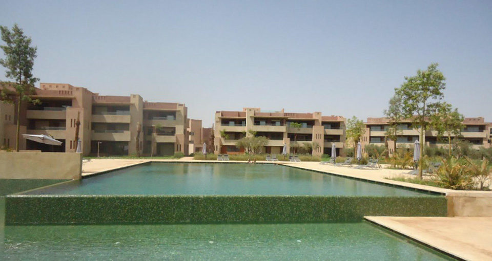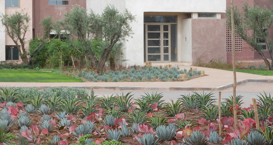 Notre démarche dans l'élaboration des aménagements paysagers du Resort MGC est de l’ancrer dans le contexte local de Marrakech pour lui donner une identité propre, en faisant ressortir les traces historiques du lieu et en développant un lieu qui se démarque des autres Resort. Les traces et la trame historique des oliveraies sont reconstituées et deviennent la structure paysagère dans laquelle s’insère tous les composantes des espaces extérieurs, tels que les terrasses et piscines, les aires de jeux, les places de détentes et les jardins de senteurs. Quelques arbres d’ornements à grand développement et des palmiers viennent ponctuer et briser la rigueur de la trame des oliviers, en offrant un contraste par leurs dimensions, feuillages, floraisons et apportant de l’ombrage.
