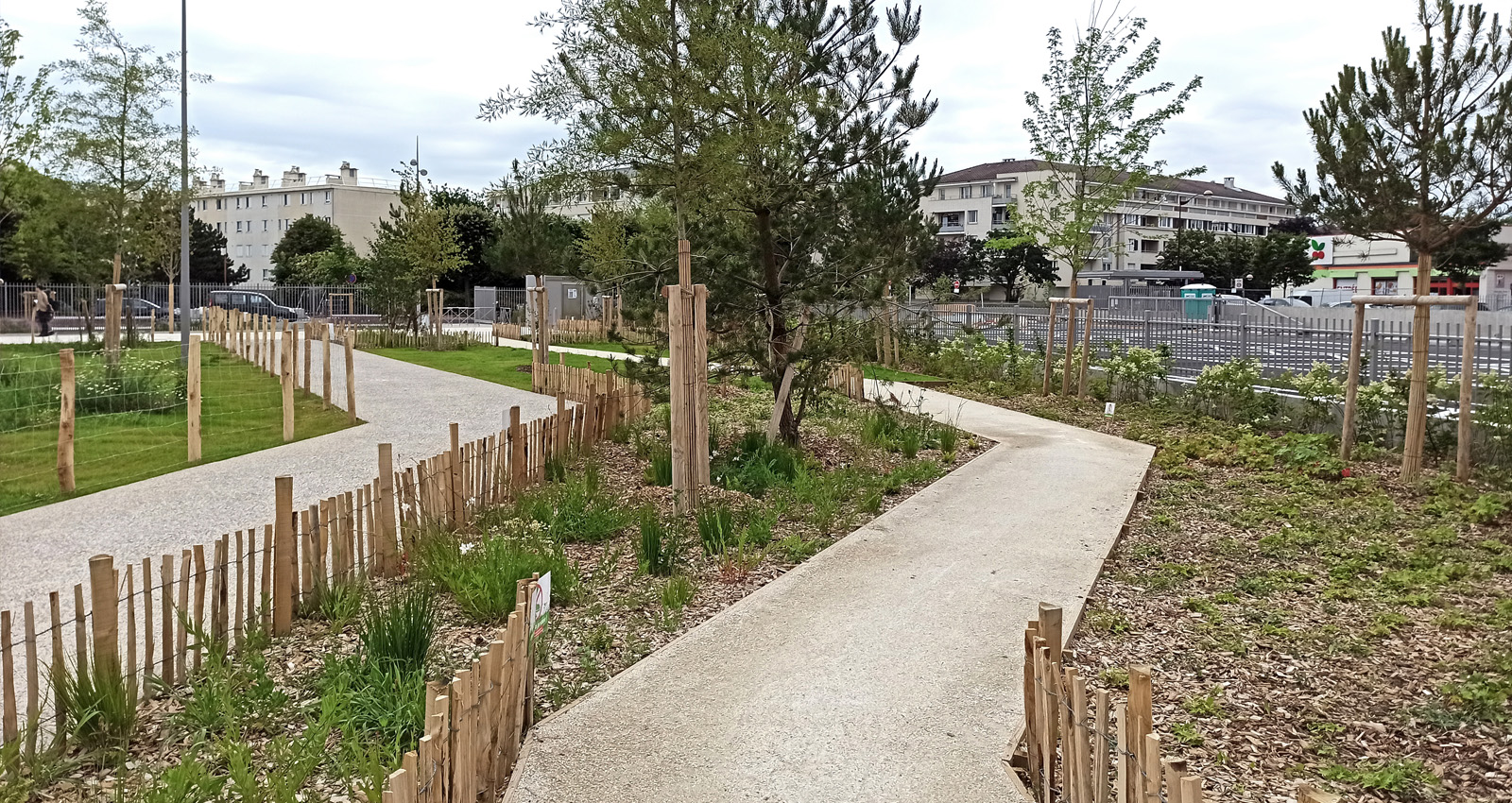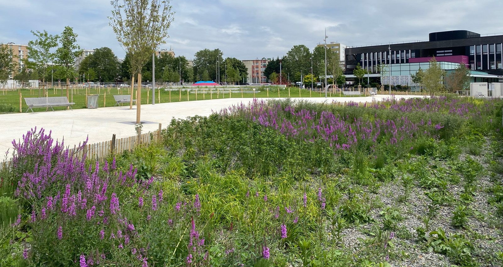 La récupération des eaux pluviales se fait en surface par un traitement paysager de noues et l’aménagement d’un jardin creux pour la rétention et le ralentissement des eaux de pluie, situé en point bas du site, au pied de l’esplanade et accueillant un massif végétal vaporeux et fleuri.