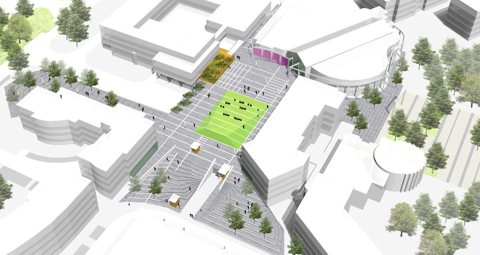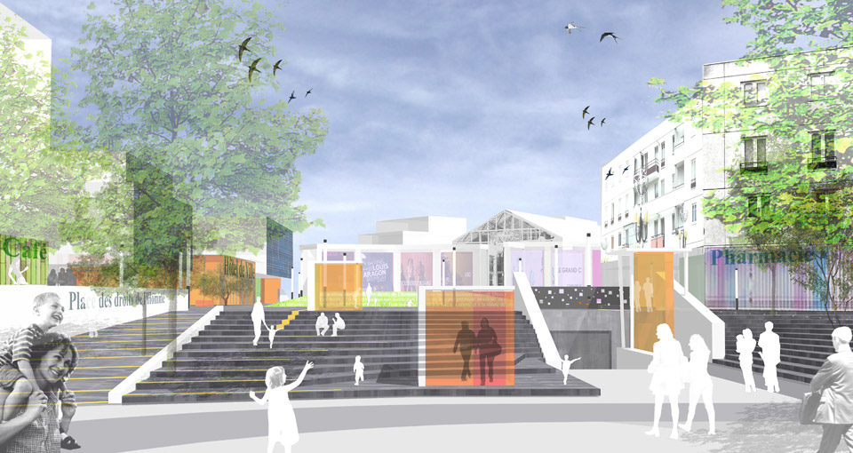 La Place des Droits de l’Homme est une place centrale réservée au piéton et superposée à un vaste parking. Cette surélévation par rapport au terrain naturel lui donne l’aspect d’un lieu confiné et introverti. Ces fonctions administratives mais également culturelles et commerciales lui donnent un rôle majeur dans une recomposition du tissu urbain. Notre démarche est de valoriser ses atouts en lui redonnant la place qu’elle occupe au cœur de la ville et dans le quotidien des Tremblaysiens. La trame au sol est l’élément fédérateur du projet, elle dialogue aussi bien avec les façades alentours qu’avec les problématiques liés au parking souterrain. Le sol semble se transformer et se déplier pour devenir un tapis vert incliné vers le théâtre.  Des emmarchements à grands volets et des rampes d’accès invitent à entrer au cœur du nouveau centre-ville. La lumière est arasée, mêlée au calepinage du sol, elle accompagne les pas des usagers de manière discrète et ludique. Ce balisage coloré et lumineux la nuit se détachera également le jour de manière plus subtile.