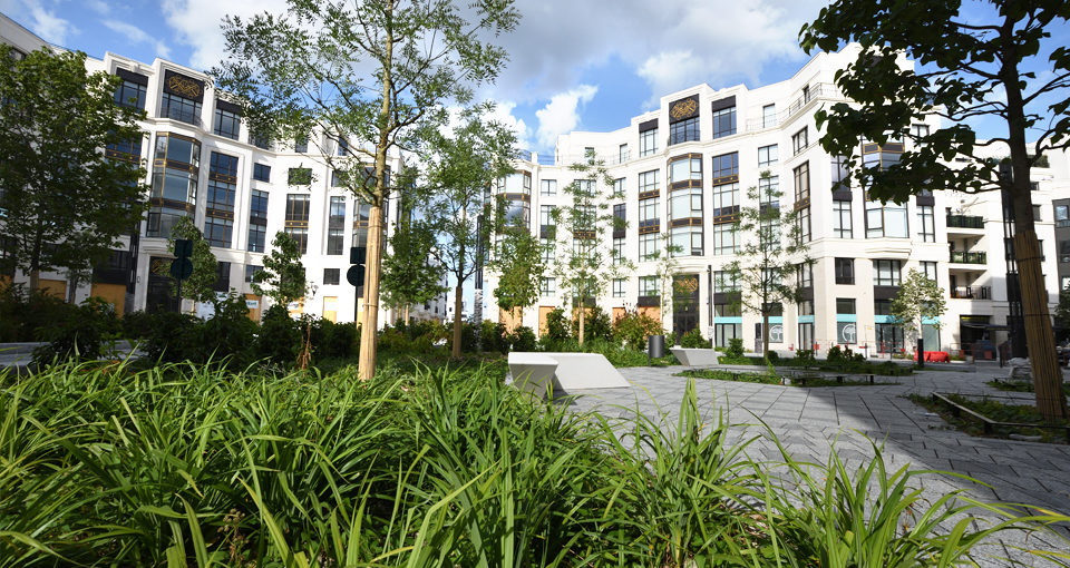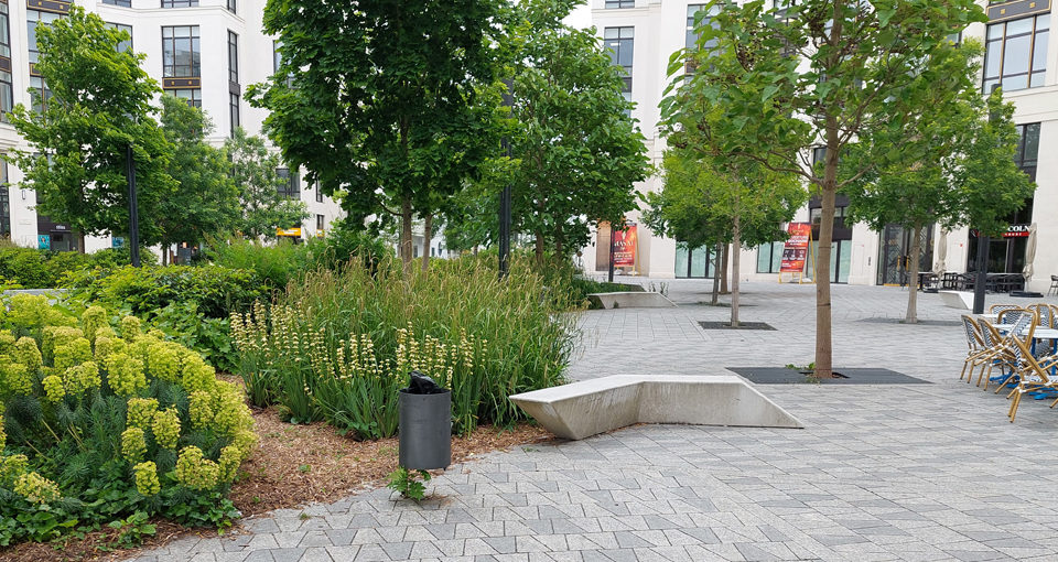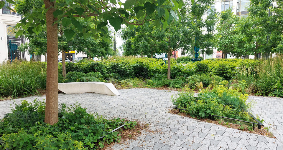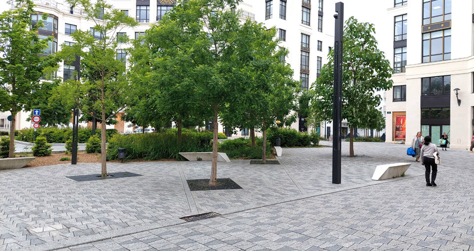 Place Octogonale  -- Le projet porte sur l’aménagement d’une place de quartier pensée comme un véritable îlot de fraîcheur urbain. Il s’appuie sur une présence végétale forte afin de lutter contre les îlots de chaleur et de favoriser la perméabilisation des sols en milieu urbain. La place est conçue comme un vaste plateau surélevé, permettant d’apaiser la circulation et de sécuriser les cheminements piétons. Cet aménagement renforce la lisibilité de l’espace public et affirme sa vocation conviviale. Les espaces piétonniers ainsi que les terrasses des cafés et commerces sont protégés et valorisés par des plantations en creux, intégrant des dispositifs de récupération et d’infiltration des eaux pluviales. Cette approche paysagère participe à une gestion durable de l’eau tout en structurant l’espace. La forte présence du végétal apporte fraîcheur et ombrage, réduit la réverbération minérale et contribue au confort ainsi qu’au bien-être des habitants. Enfin, un calepinage décoratif spécifique a été conçu afin de conférer à cette place une identité singulière et affirmée, à la hauteur de son rôle emblématique au cœur du quartier.