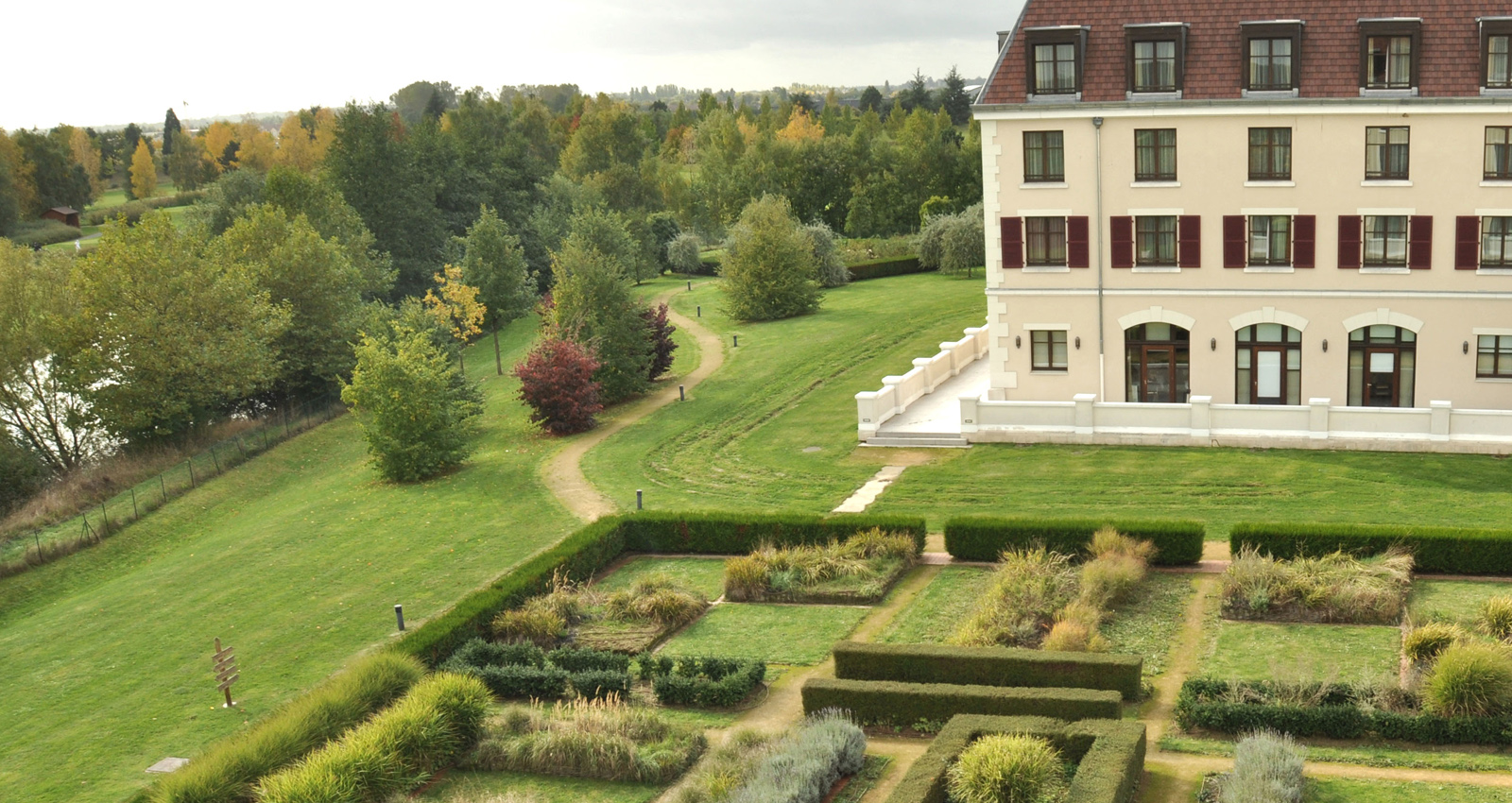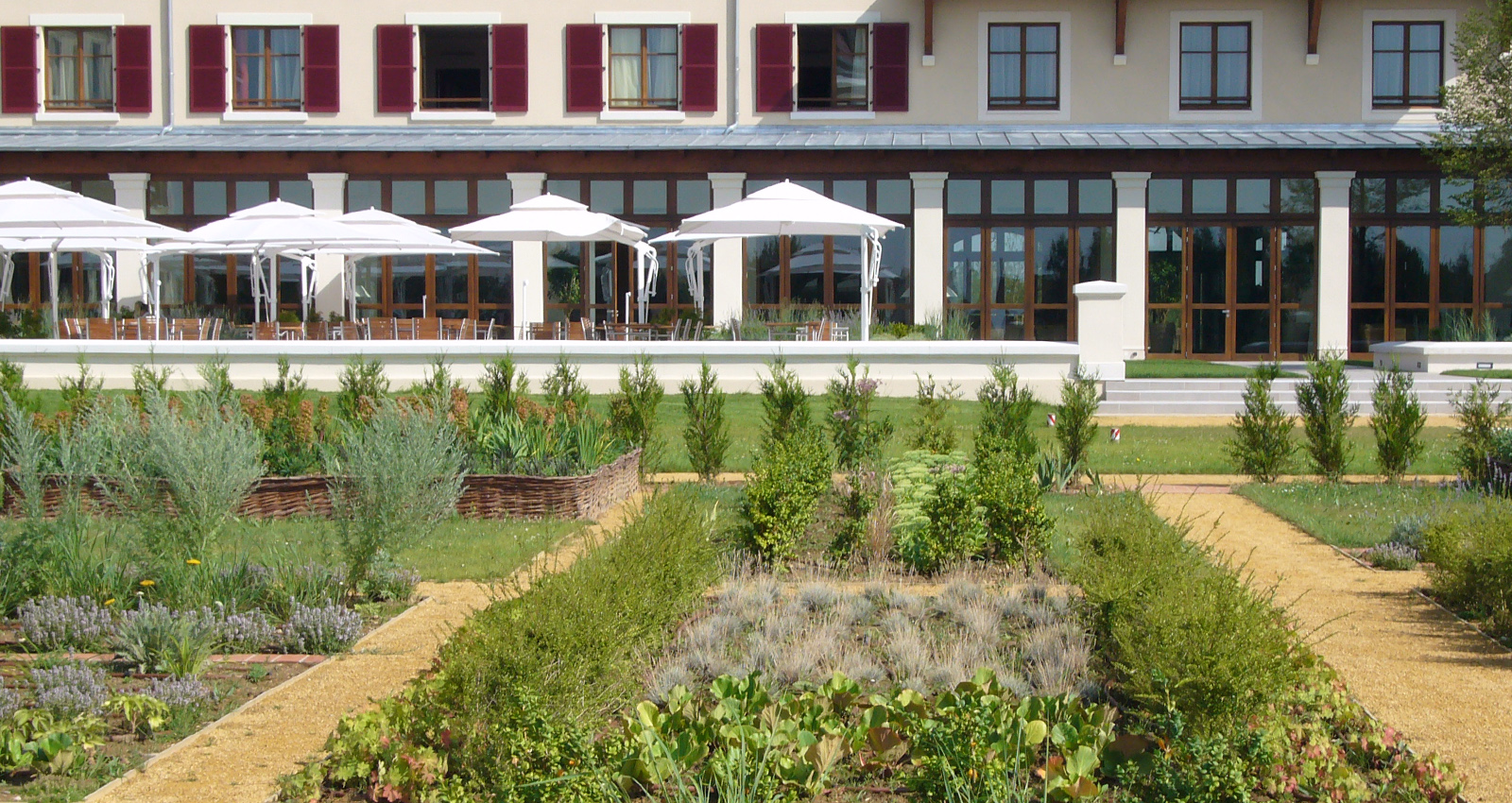 The site of the Radisson Golf Hotel adjoins the Disneyland Paris golf course, which surrounds it on three sides. The landscaping takes this into account and highlights the value of the existing site, incorporating strong elements of the site such as the topography, that offers views towards the golf course, the undulating nature of the course itself and the small lake below that borders the south western edge of the site, providing an attractive foreground within the overall landscape. The main entrance to the hotel is planted with a row of cherry trees in continuity with the existing row. It forms an avenue that leads to the domain from the local road. A grid of ornamental flowering trees, in reference to the local orchards is interspersed with the parking spaces. This grid continues towards the western side of the hotel integrating a cricket ground and a children’s play area. The vegetation around the site merges with the existing planting on the golf course to form a single canvas. The interior courtyards of the hotel are designed in a simple and minimalist fashion using a farmyard vocabulary. The secondary courtyard to the south of the project includes a vegetable garden enclosed by a hedge, giving it an intimate feel and framing the view of the golf course.