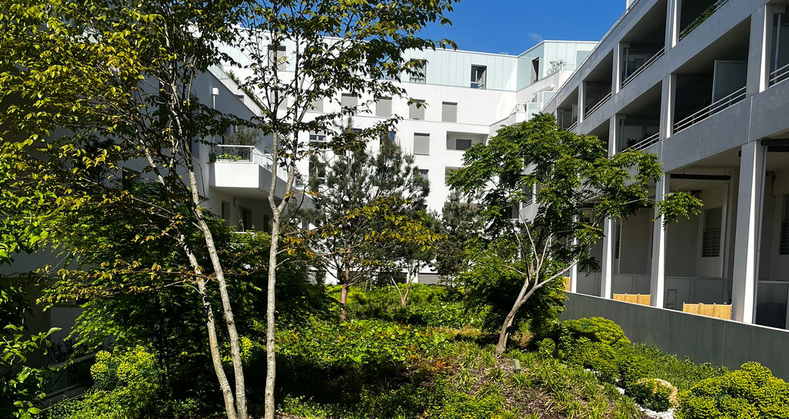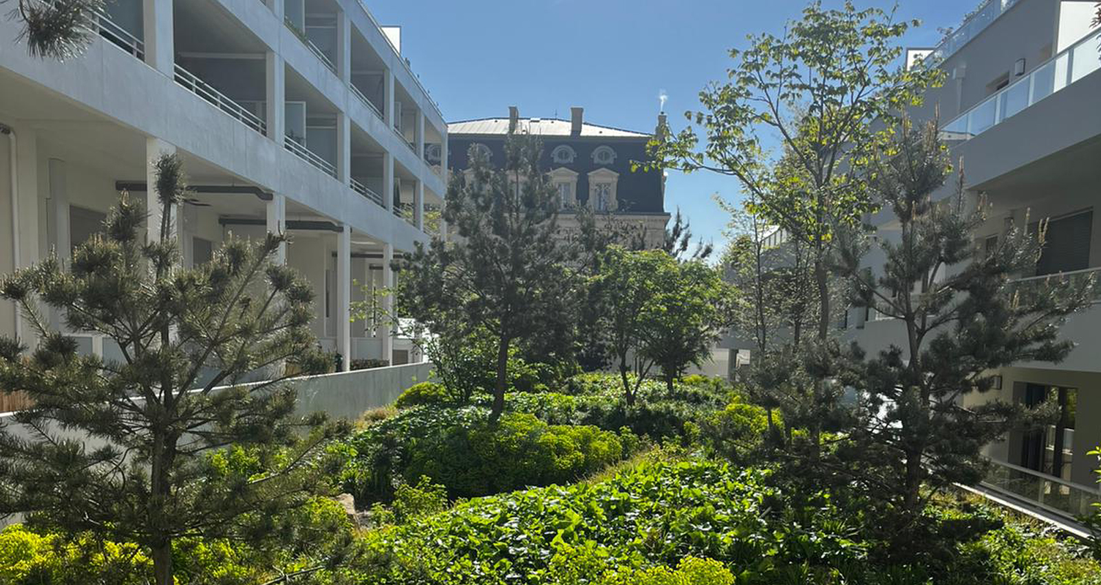 Aménagement paysager d’un cœur d’îlot et création d’un jardin sur dalle d’environ 1 000 m², complétés par l’installation de bacs plantés sur l’ensemble des terrasses et loggias des six niveaux du bâtiment. Ces dispositifs végétalisés viennent sublimer les façades élégantes du projet et renforcer son identité haut de gamme. En interface avec l’espace public, des jardinières en pleine terre et quelques arbres tiges sont également implantés en pied d’immeuble, participant à l’intégration paysagère de l’opération sur le site prestigieux de l’ancienne Poste du Boulingrin à Reims.