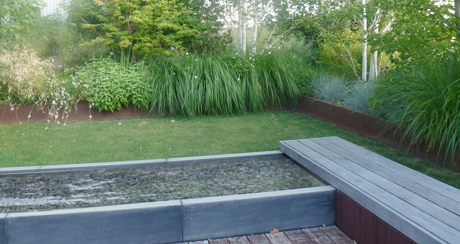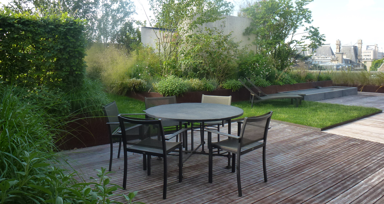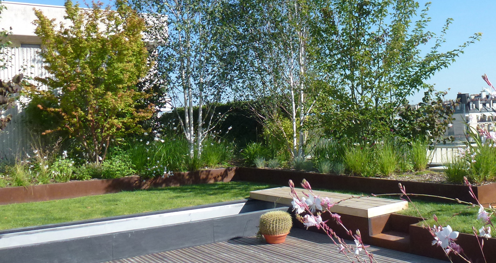 Contenant les édicules techniques du bâtiment des bosquets arbustif et des haies préformées viennent les masqués créent des espaces plus intimes à l’abri des regards. Ces espaces s’articulent autour de terrasses bois qui viennent dialoguer avec les bacs en corten. Un bassin comme pièce centrale de la terrasse côtoie des espaces engazonnées qui invite à la détente à l’ombre des bouleaux en cépée. Les plantations ont été choisies pour donner de la souplesse à toutes ces lignes orthogonales et ainsi donner une lecture plus organique au projet.
