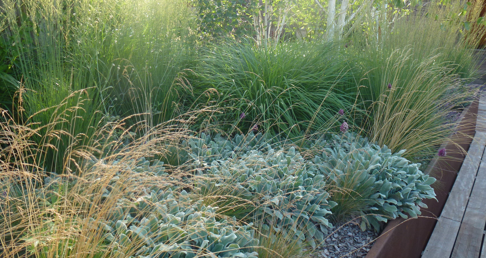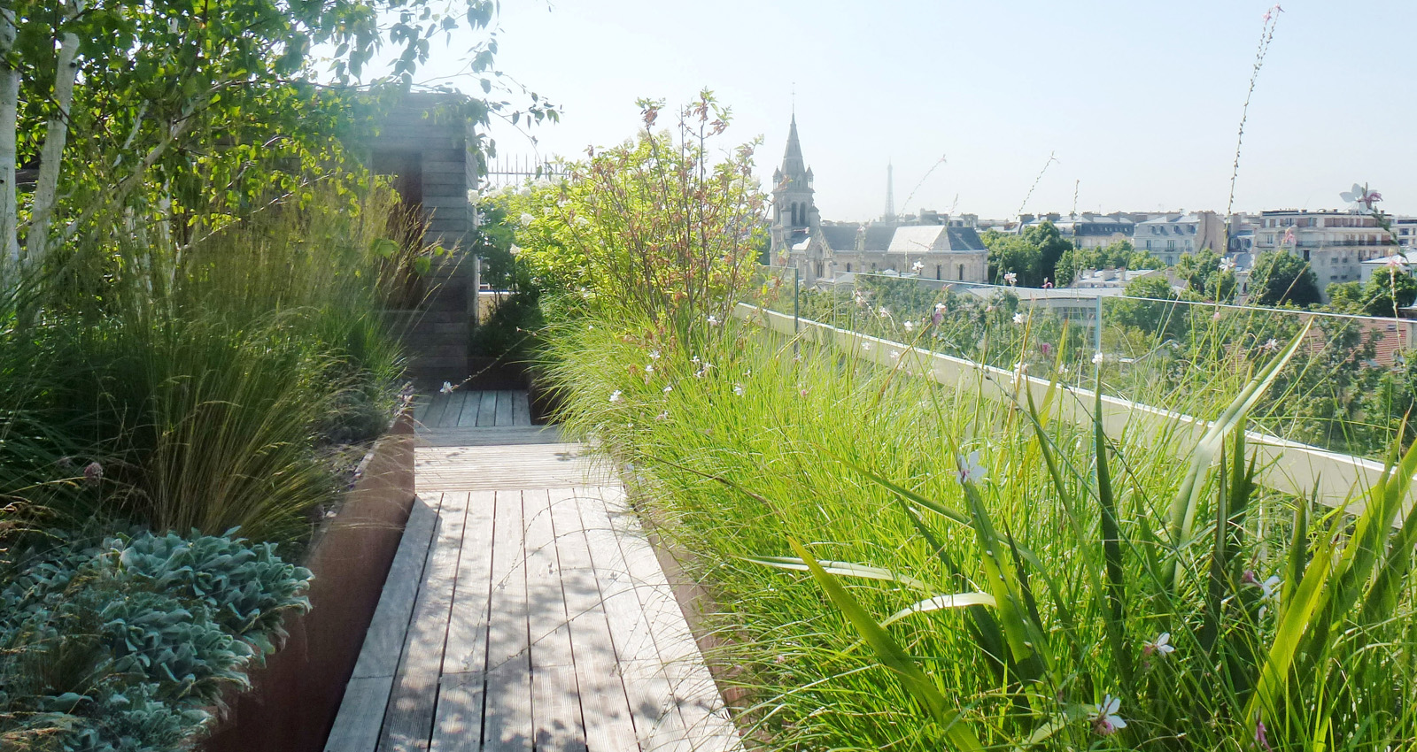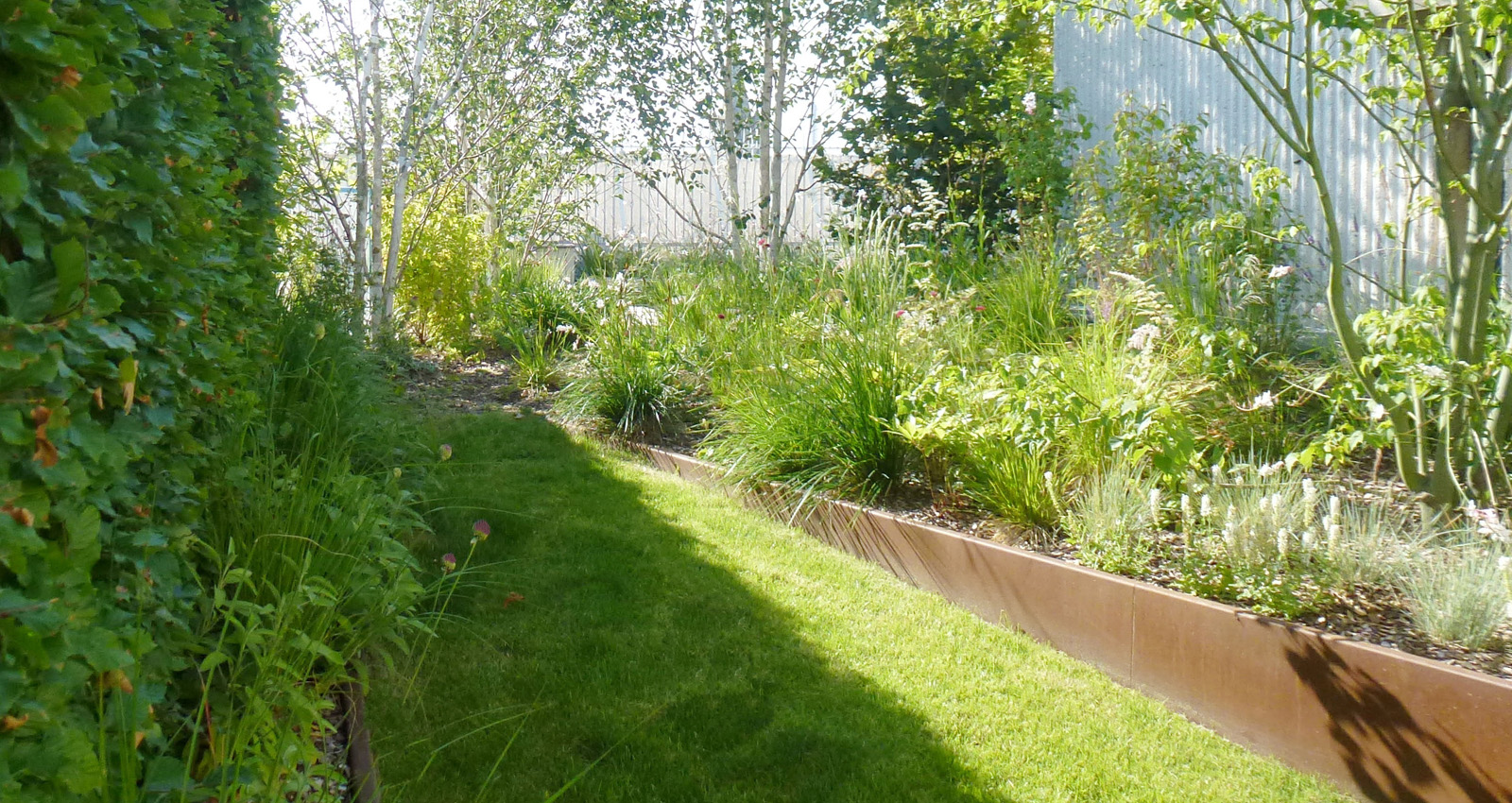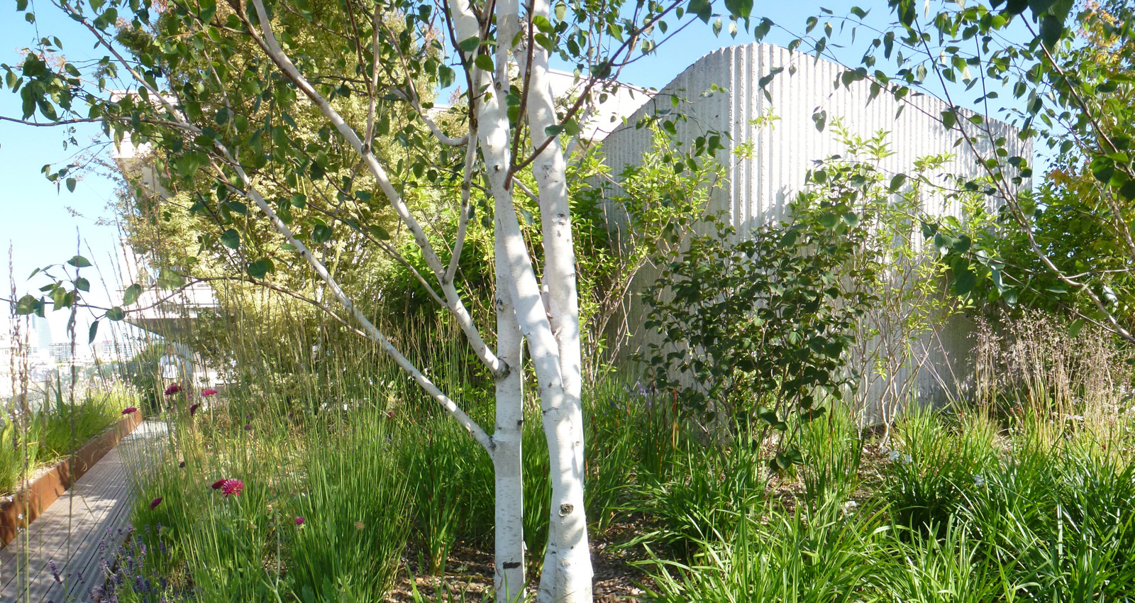 Contenant les édicules techniques du bâtiment des bosquets arbustif et des haies préformées viennent les masqués créent des espaces plus intimes à l’abri des regards. Ces espaces s’articulent autour de terrasses bois qui viennent dialoguer avec les bacs en corten. Un bassin comme pièce centrale de la terrasse côtoie des espaces engazonnées qui invite à la détente à l’ombre des bouleaux en cépée. Les plantations ont été choisies pour donner de la souplesse à toutes ces lignes orthogonales et ainsi donner une lecture plus organique au projet.